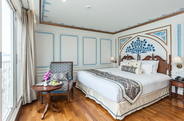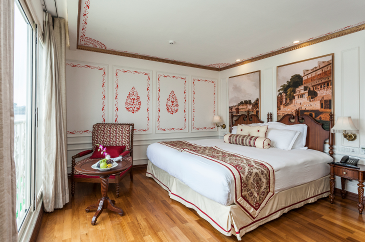 The most luxurious and spacious suite aboard, with 400 sq. ft. of space, the Maharaja Suite is a haven of luxury. Embellished with Persian rugs, Burma teak floors and rich tapestry, it also has a flat screen TV, on-demand movie service, and a writing desk. Bathrooms are as luxurious as the room and are fitted with both spacious bathtub and shower panels. Daily butler service and in-room dining are also available on request.